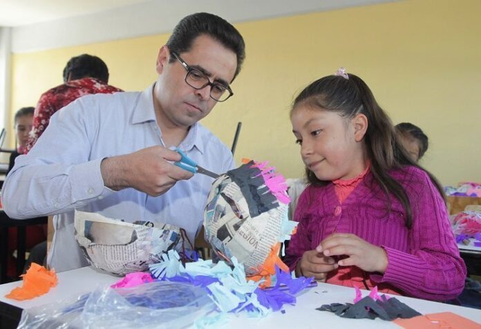 Ahí, el funcionario estatal destacó la labor de los cuates-guía, quienes enseñan a los alumnos a utilizar material de desecho, como plásticos y papel, para la elaboración de juguetes y máscaras con las que pueden jugar y divertirse, tanto en la escuela como en el hogar.