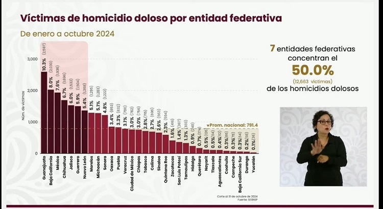 A nivel nacional, siete entidades federativas concentran el 50 por ciento de los homicidios dolosos y son Guanajuato, Baja California, Estado de México, Chihuahua, Jalisco, Guerrero y Nuevo León.