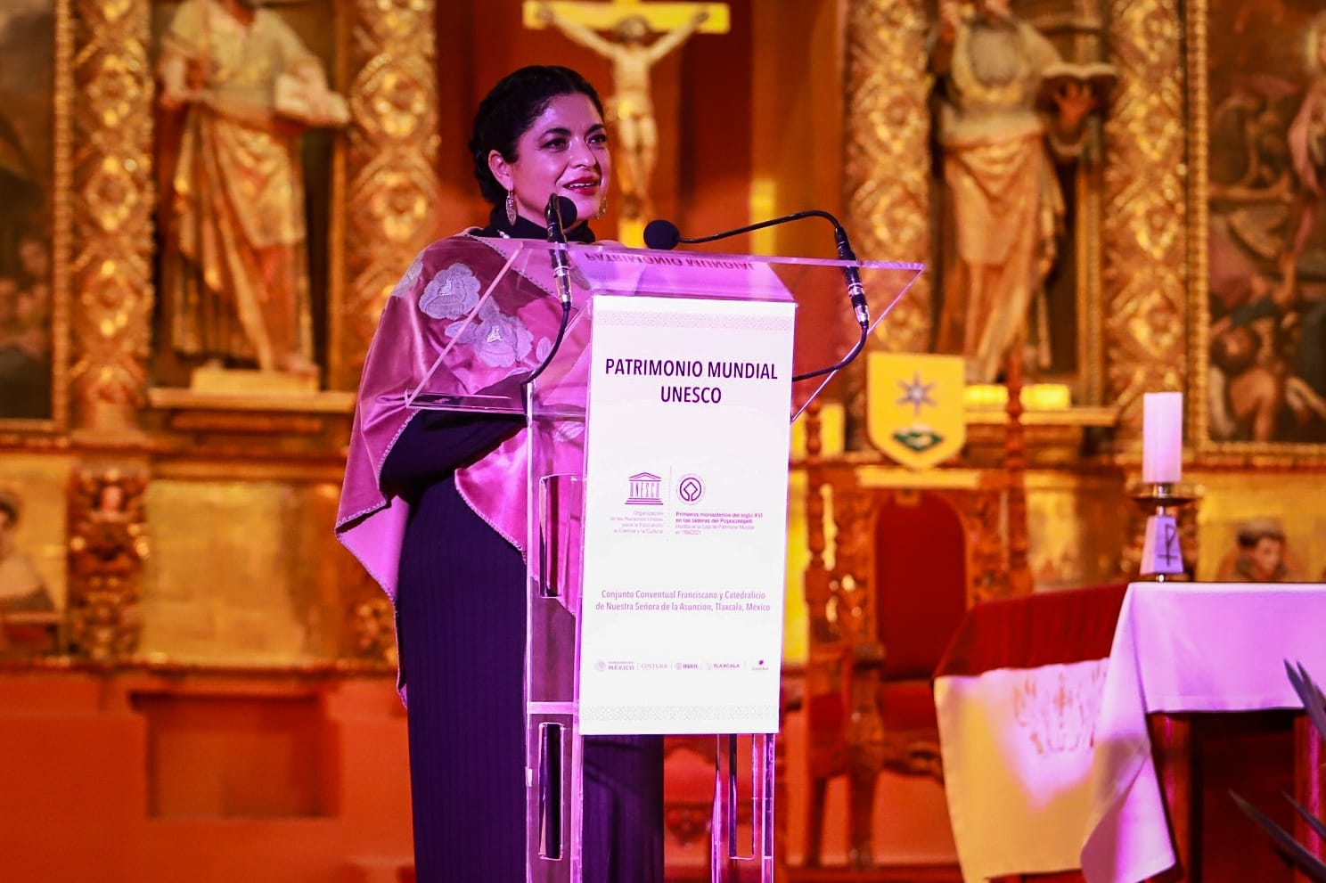 En la explanada del Conjunto Franciscano y Catedralicio de Nuestra Señora de la Asunción, el Gobernador Mena y la Secretaria Alejandra Frausto, acompañados por Lorena Cuéllar Cisneros, Gobernadora Electa de Tlaxcala, autoridades de los tres órdenes de gobierno y eclesiásticas, realizaron la develación de una placa sobre la incorporación de este espacio a la lista de Patrimonio Mundial de la Unesco y otra que contiene los planos del conjunto.