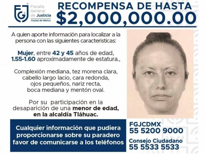 La Fiscalía General de Justicia (FGJ) de la Ciudad de México difundió este martes el retrato hablado de la mujer que se llevó a Fátima Cecilia de la escuela, el pasado 11 de febrero, y quien aparece en un video caminando con la menor de siete años de la mano.