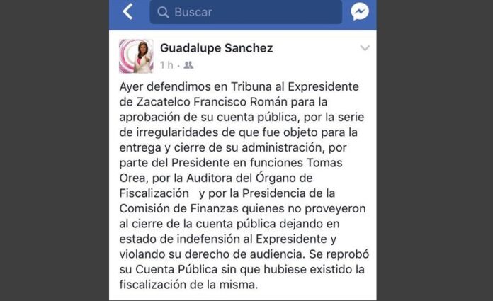 En tanto esta mañana la diputada Guadalupe Sánchez Santiago, miembro de la Comisión de Finanzas y Fiscalización del Congreso del Estado, lamento en su red social la imparcialidad por algunos miembros del congreso «Ayer defendimos en Tribuna al Expresidente de Zacatelco Francisco Román para la aprobación de su cuenta pública, por la serie de irregularidades de que fue objeto para la entrega y cierre de su administración, por parte del Presidente en funciones Tomas Orea, por la Auditora del Órgano de Fiscalización y por la Presidencia de la Comisión de Finanzas quienes no proveyeron al cierre de la cuenta pública dejando en estado de indefensión al Expresidente y violando su derecho de audiencia. Se reprobó su Cuenta Pública sin que hubiese existido la fiscalización de la misma».