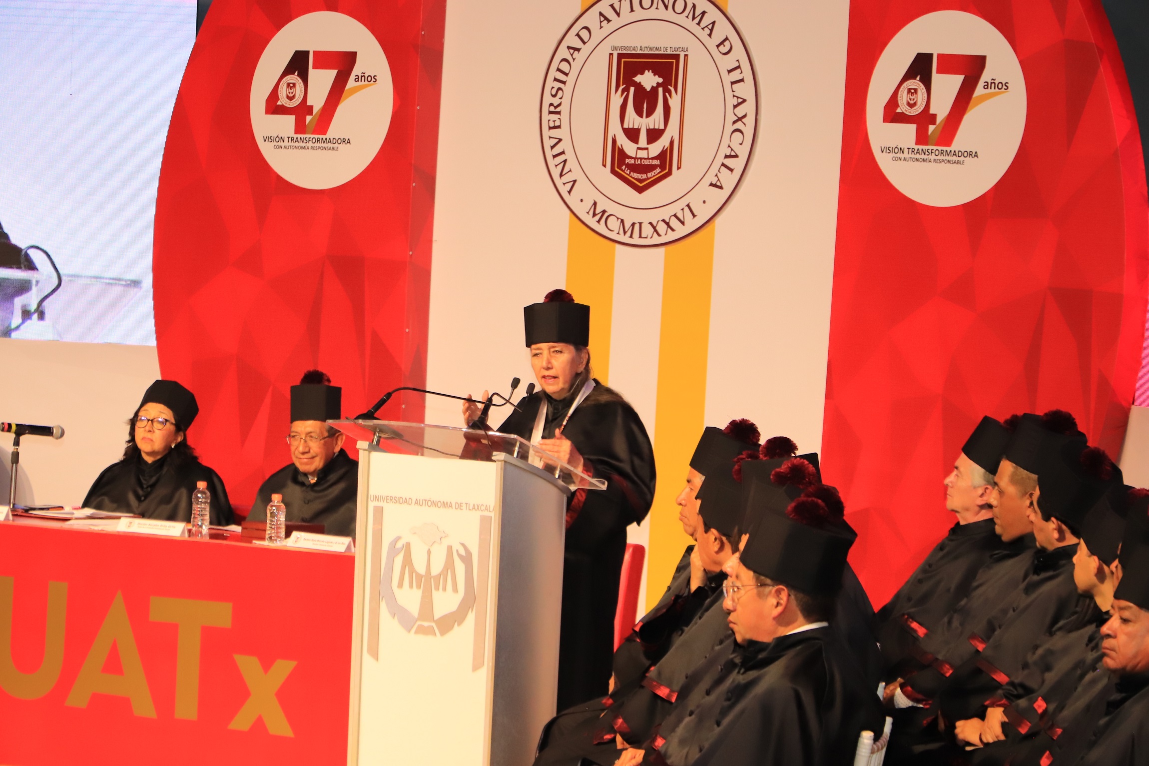 El Doctor Serafín Ortiz Ortiz, Rector de la Universidad Autónoma de Tlaxcala (UATx), encabezó la sesión pública y solemne del Honorable Consejo Universitario conmemorativa al 47 aniversario de su fundación, en la que se impuso el grado de Doctor Honoris Causa a María Marcela Lagarde y de los Ríos, por sus aportaciones al fortalecimiento de la cultura feminista, la equidad de género, al abatimiento de la violencia en cualquiera de sus formas y por ser quien constituyera el término de feminicidio en el país.