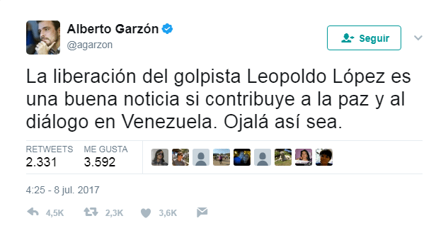 La salutación de Alberto Garzón, en Twitter, al preso político venezolano Leopoldo López, calificándolo como “golpista”, después de que este haya recibido la rebaja de su condena en la cárcel, sustituida por un arresto domiciliario, hace pensar de nuevo en la impactante ceguera de una parte de la izquierda española, que sigue sin condenar los gobiernos totalitarios que le son afines ideológicamente, como ya hiciera con los de Stalin y Castro.