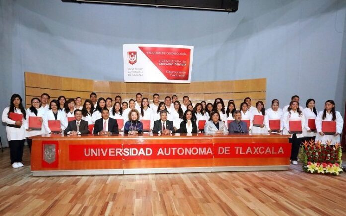 Teniendo el Teatro Universitario como recinto, el Mtro. Rubén Reyes Córdoba, Rector de la Universidad Autónoma de Tlaxcala (UAT), encabezó el acto protocolario de graduación de la generación número 42 de la Licenciatura en Cirujano Dentista que se imparte en la Facultad de Odontología, convirtiéndose así en la segunda bajo el plan curricular inserto en el Modelo Humanista Integrador basado en Competencias (MHIC), el cual les brinda conocimientos y habilidades con estándares de calidad, a la vez que reafirma valores para su vida personal y profesional.