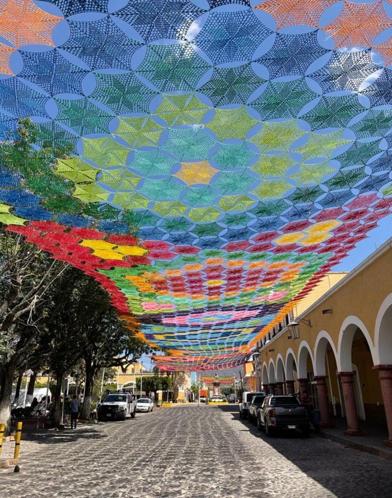 El colectivo «Cielo tejido», formado por unas 150 mujeres y hombres, ha logrado que su trabajo no solo cubra las calles de su natal Etzatlán, en el occidental estado de Jalisco, sino que también obtuviera un Guinness World Records al ser considerado el pabellón de tejido más grande del mundo con casi 3.000 metros cuadrados.