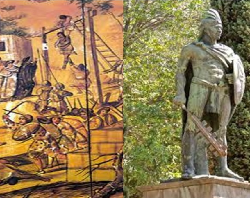 Ala derecha, representación del colgamiento de Xicohténcatl «el joven» en 1521. A la derecha, foto de su estatua en la Plaza Xicohténcatl. IMAGEN La Jornada de Oriente