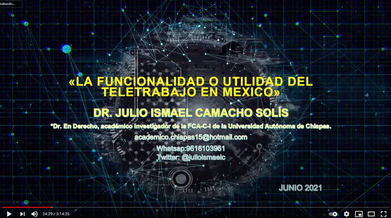 El foro inició la tarde de ayer con la conferencia magistral “La funcionalidad del Teletrabajo en México”, impartida por el Dr. Julio Ismael Camacho Solís, quien tiene las licenciaturas en Derecho y Administración de Empresas por la Universidad Veracruzana, así como la maestría en Administración y doctorado en Derecho Público por la Universidad Autónoma de Chiapas.
