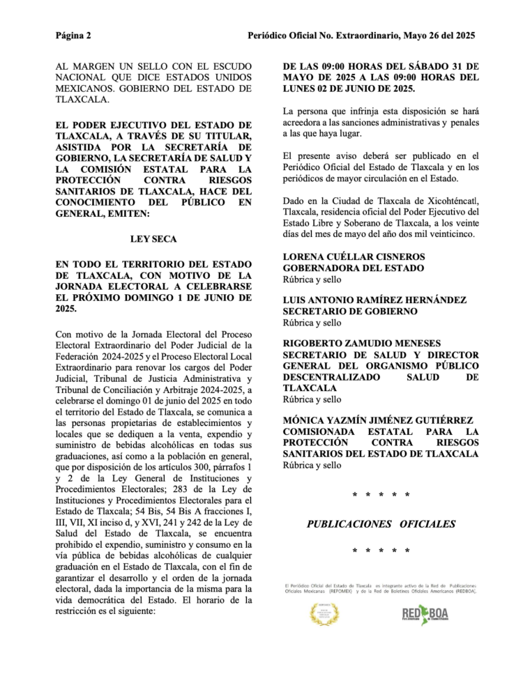 El documento, publicado este 26 de mayo en el Periódico Oficial del Estado de Tlaxcala, está avalado por la gobernadora Lorena Cuellar Cisneros, y los titulares de las secretarías de Gobierno (Segob) y Salud (Sesa), así como la Comisionada Estatal para la Protección contra Riesgos Sanitarios del Estado.