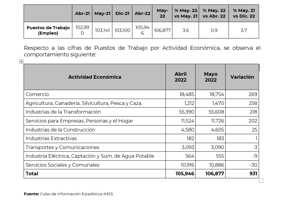 En el lapso de un año, entre 31 de mayo de 2021 y mismo día de 2022 el número de puestos de trabajo con seguridad social pasó en Tlaxcala de 103 mil 141 a un total actual de 106 mil 877, esto es, aumentó en 3 mil 736 empleos.