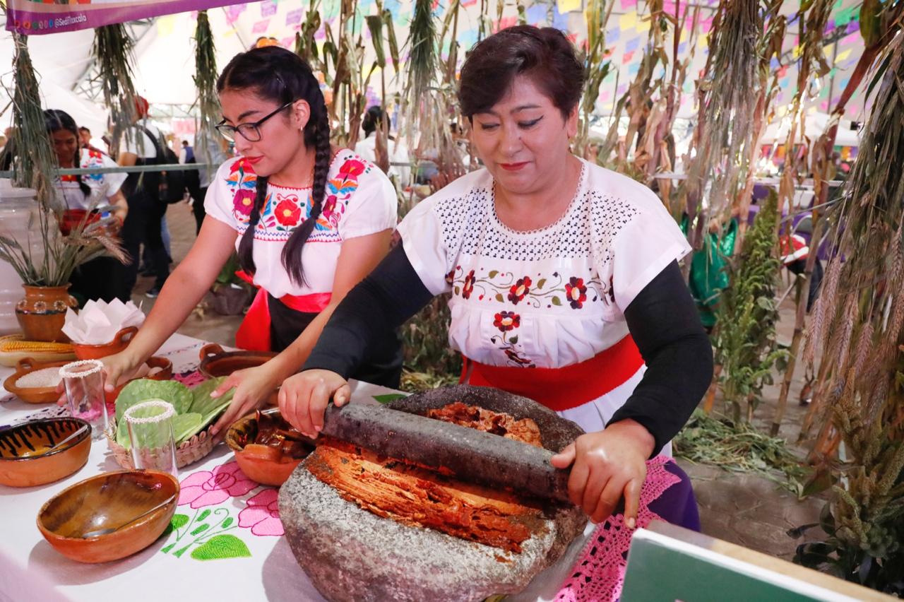 Desde muy temprano, el ambiente se llenó de entusiasmo y alegría, con la llegada de los representantes de cada municipio para ser parte de la Muestra Gastronómica, todas y todos los participantes montaron sus stands decorados con elementos típicos de su localidad. Cada uno de ellos ofrecía una muestra de su gastronomía, reflejando las tradiciones culinarias heredadas de generación en generación. Los colores vivos de los huipiles, las figuras de barro, los bordados y las flores, adornaban los espacios, transformando el lugar en un recorrido por las raíces de Tlaxcala.