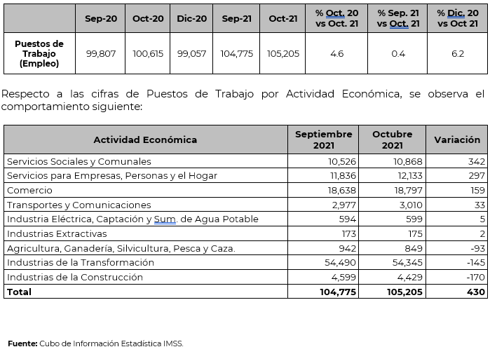 Así, al corte del 31 de octubre de 2021 el empleo formal o registrado ante el IMSS asciende en Tlaxcala a 105,205 puestos laborales. Esta cantidad representa el 7.8% de la población total del estado de Tlaxcala (1 millón 343 mil habitantes, según el último censo del INEGI).