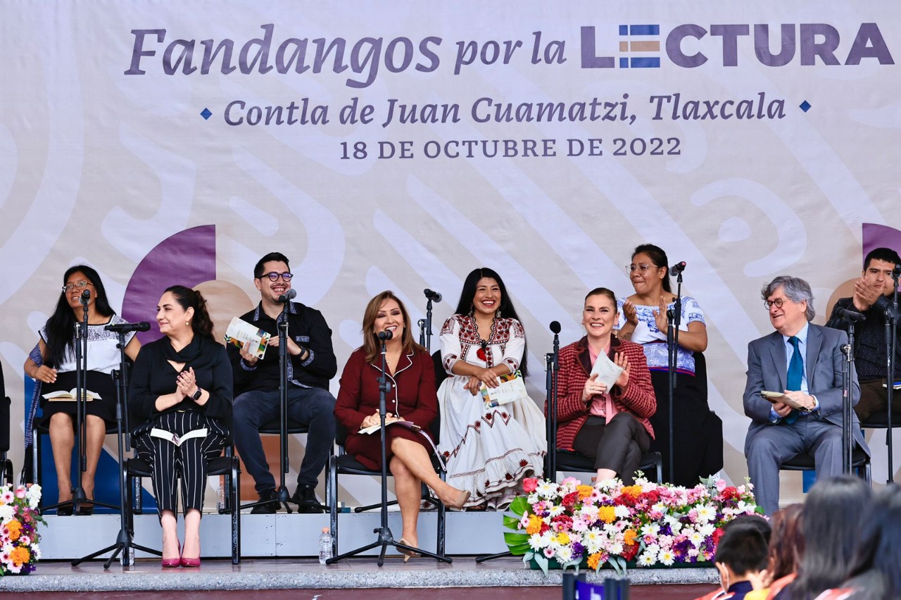 La gobernadora Lorena Cuéllar Cisneros y la consejera honoraria de la Memoria Histórica y Cultural de México, Beatriz Gutiérrez Müller, encabezaron los “Fandangos por la Lectura” en el municipio de Contla, donde se llevaron a cabo lecturas públicas, actividades culturales y expresiones musicales.