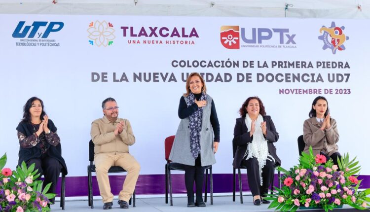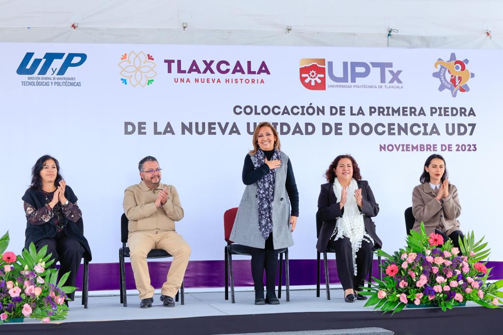 La gobernadora Lorena Cuéllar Cisneros encabezó el arranque de obra de un nuevo edificio denominado Unidad de Docencia número siete (UD7) en la Universidad Politécnica de Tlaxcala (UPTx), donde colocó la primera piedra con la finalidad de atender la demanda de aspirantes para ingresar a esta institución.