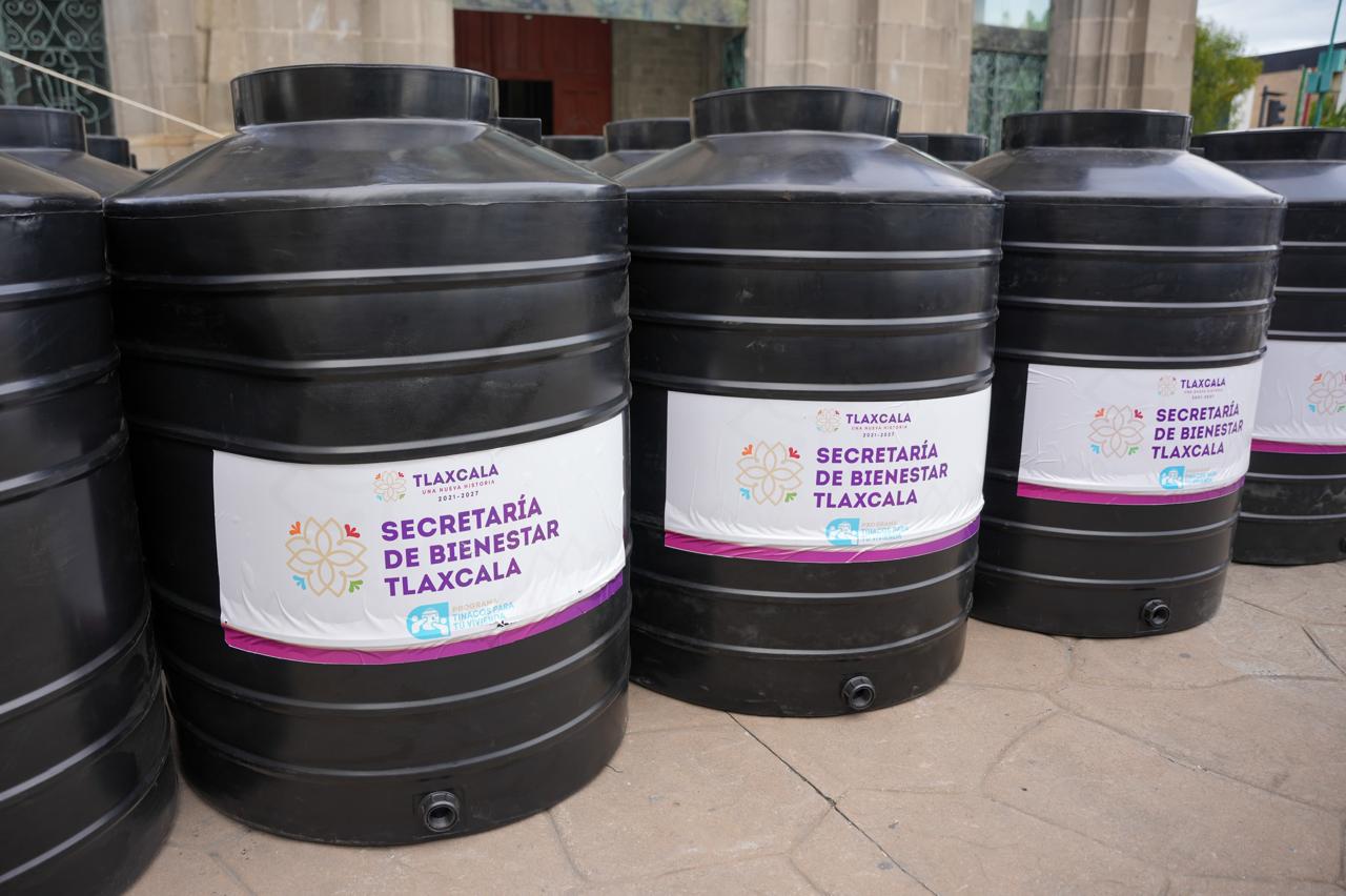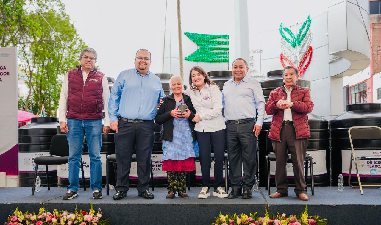 Como parte del evento, Fernanda Espinosa de los Monteros Cuéllar entregó simbólicamente cinco tinacos con capacidad de almacenar mil 200 litros cada uno, de los 174 apoyos que se distribuirán a familias apizaquenses.