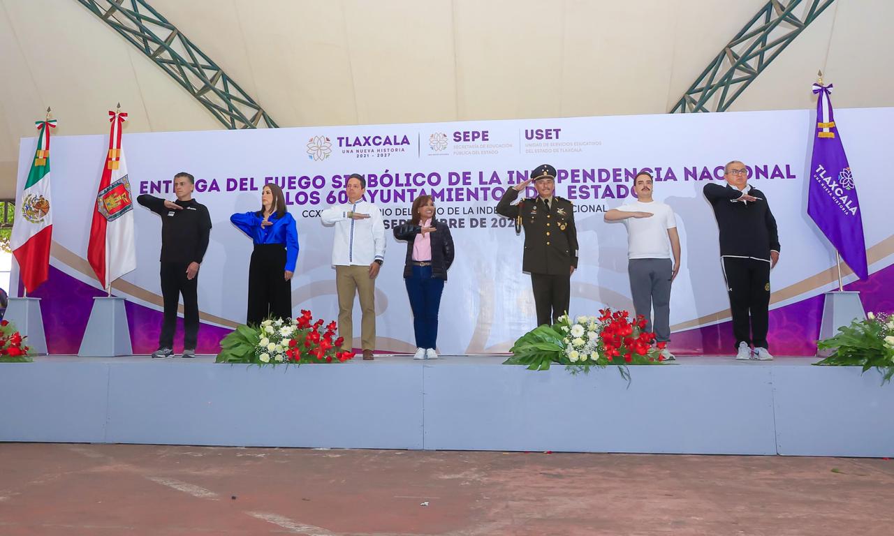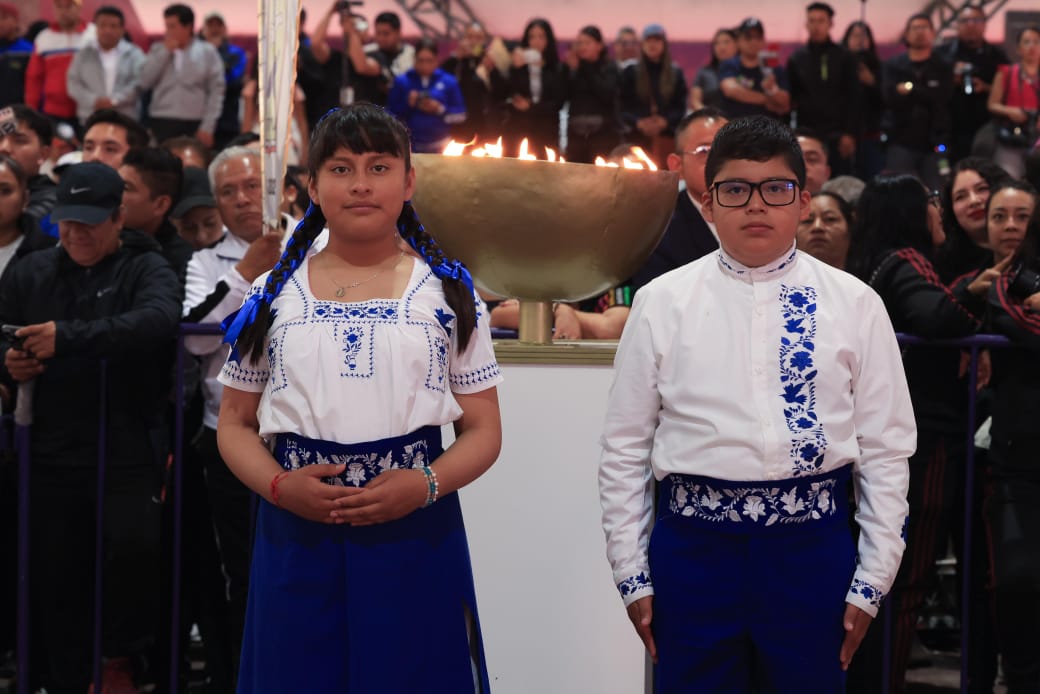 La mandataria estatal recibió el fuego de manos de los estudiantes de la primaria bilingüe “Tepeyolotzin” de la comunidad Guadalupe Tlachco, municipio de Santa Cruz Tlaxcala, Yaneth Bautista Juárez y Fabricio Bautista Bautista, para posteriormente entregarlo a los 60 presidentes municipales, quienes acudieron acompañados de sus respectivos cabildos e integrantes de sus ayuntamientos.