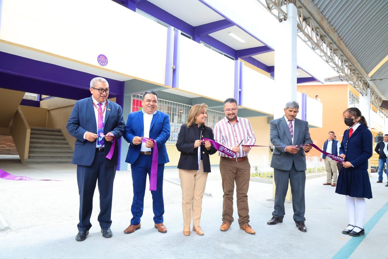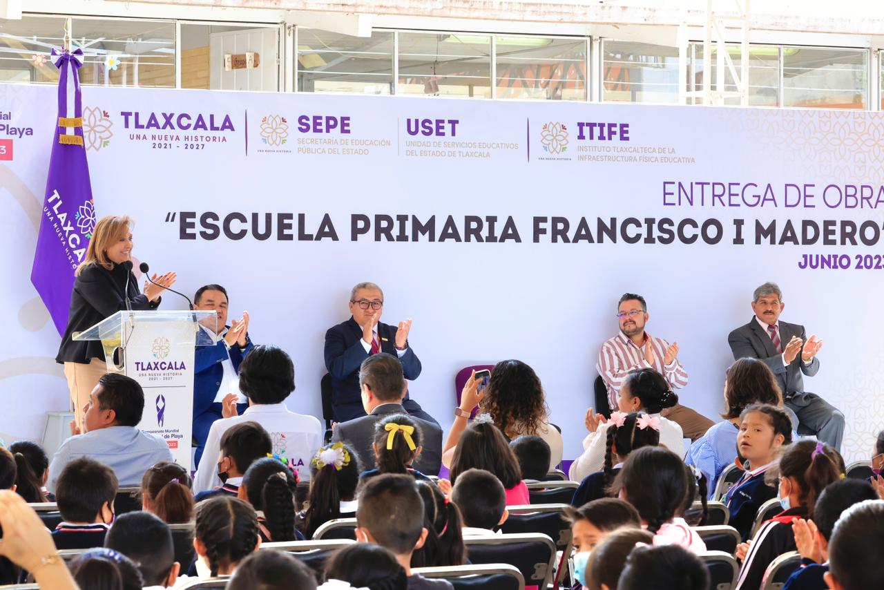 La titular del Ejecutivo local, Lorena Cuéllar Cisneros, entregó equipamiento e infraestructura educativa en la escuela primaria estatal Francisco I. Madero del barrio de Santiago, en el municipio de San Pablo del Monte, con una inversión superior a 2.4 millones de pesos en beneficio de 539 alumnos y alumnas.