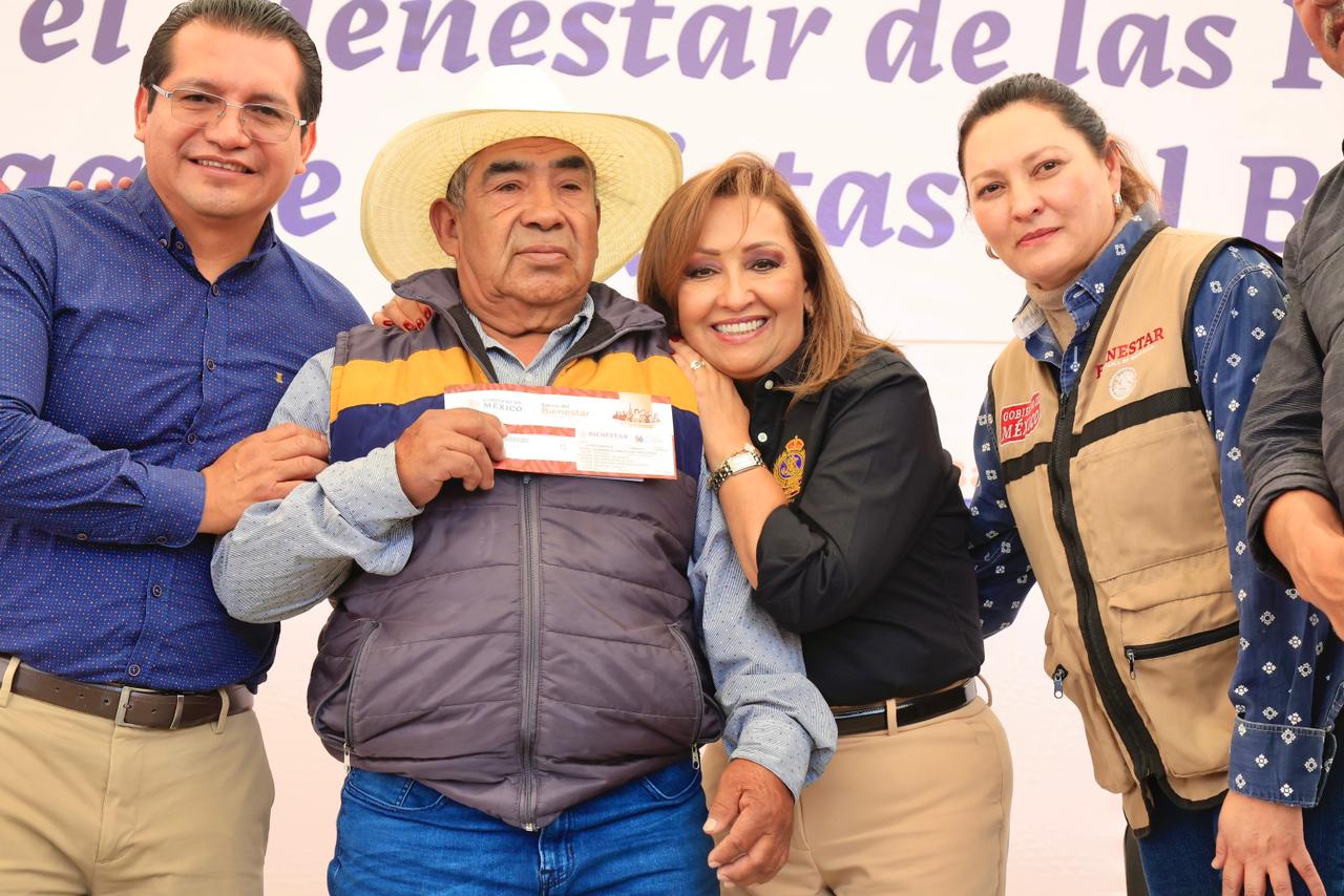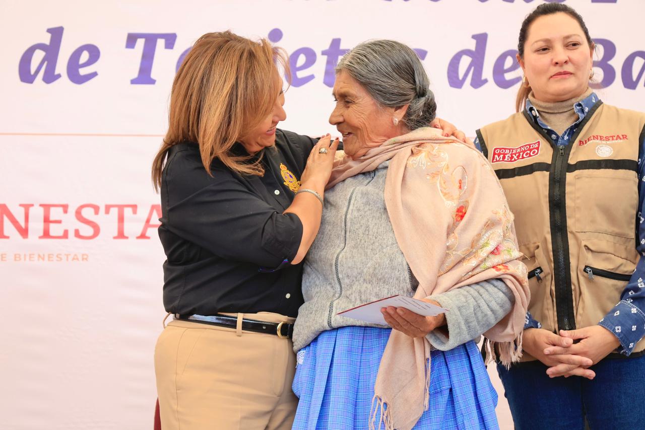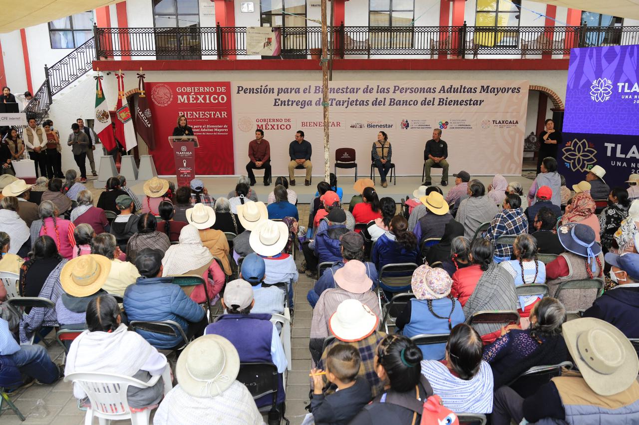La titular del Ejecutivo local, Lorena Cuéllar Cisneros, acompañada del delegado de los programas para el Bienestar, Carlos Luna Vázquez, entregó 300 tarjetas de la Pensión para el Bienestar de las Personas Adultas Mayores a derechohabientes del municipio de San Pablo del Monte.