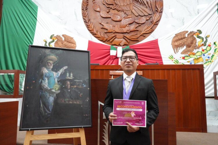 Tlaxcala, Tlax., a 11 de febrero de 2023.- Las y los diputados integrantes de la LXIV Legislatura del Congreso del Estado de Tlaxcala en Sesión Extraordinaria Pública y Solemne, entregaron la presea al arte «Maestro Desiderio Hernández Xochitiotzin» 2023 al pintor Aldo Ivanoe Varela García con su obra «Luz y Magia Tlaxcallan».
