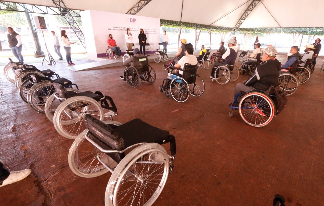 Dieciocho tlaxcaltecas con discapacidad recibieron este miércoles sillas de ruedas con autopropulsión de manos de Mariana Espinosa de los Monteros, presidenta honorífica del sistema estatal para la familia (SEDIF), la directora Laura García y la jefa departamental Jacqueline Meneses.