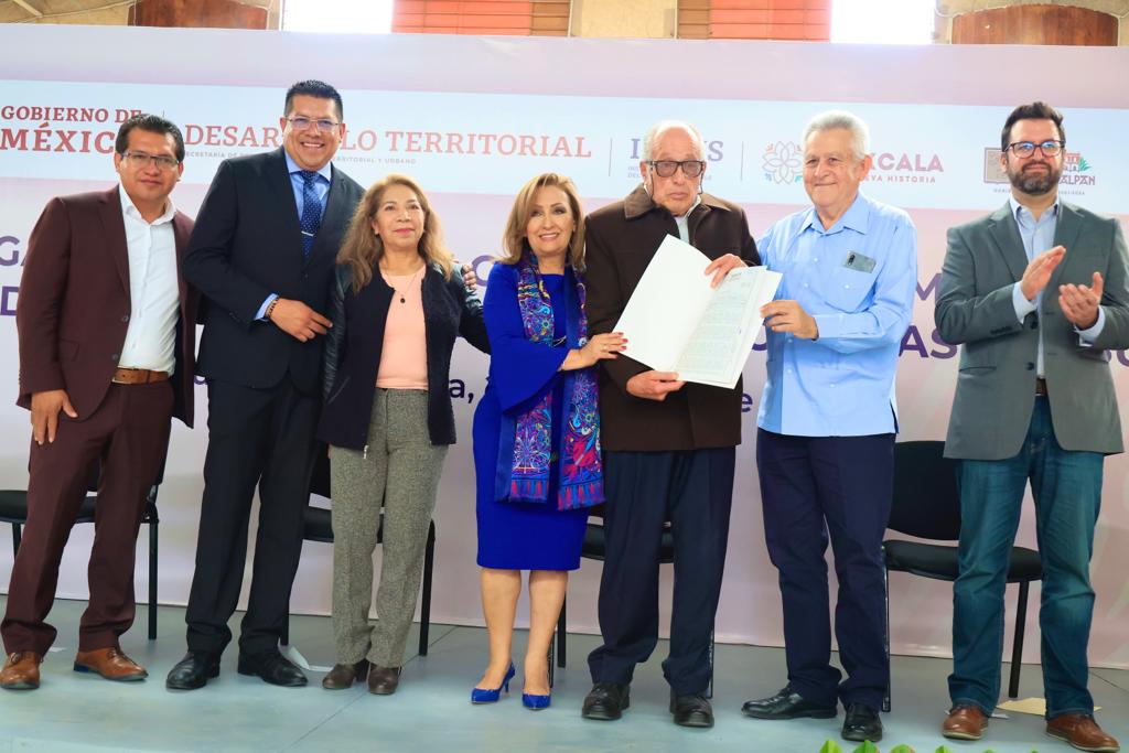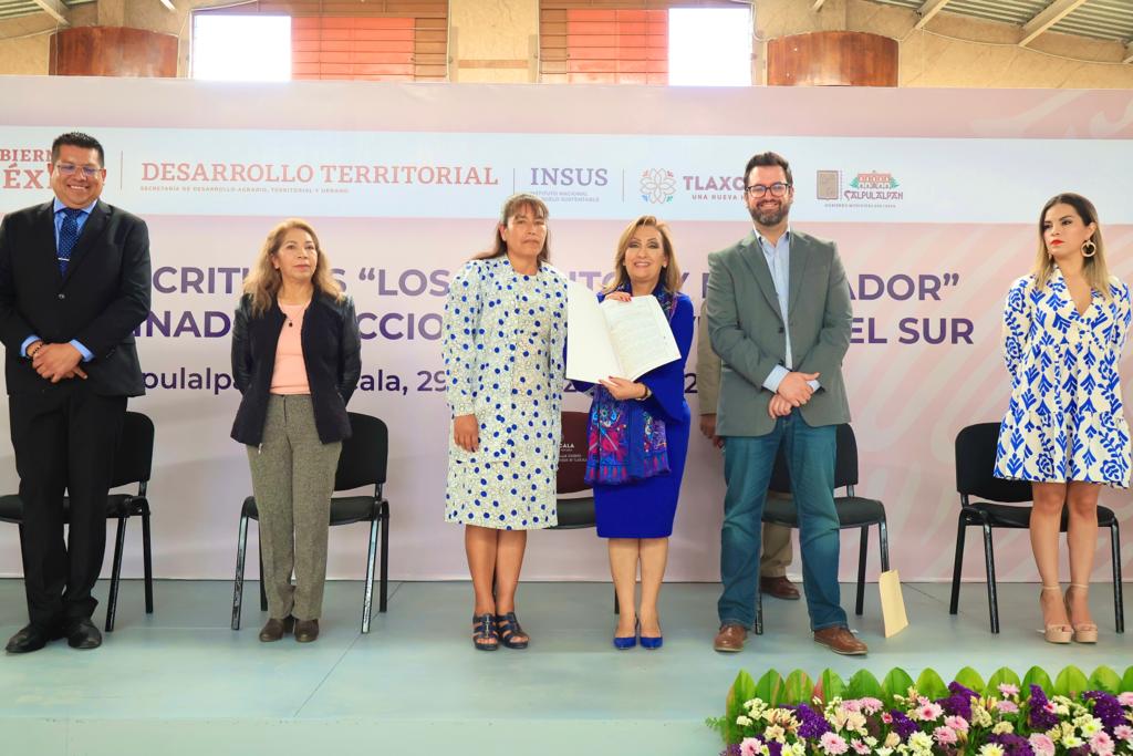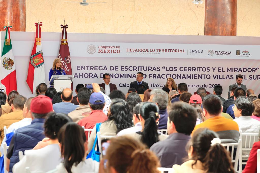 La gobernadora Lorena Cuéllar Cisneros y el director general del Instituto Nacional del Suelo Sustentable (Insus), dependiente de la Secretaría de Desarrollo Agrario, Territorial y Urbano (Sedatu), José Alfonso Iracheta Carroll, entregaron escrituras a 140 familias de las colonias Los Cerritos y El Mirador del municipio de Calpulalpan, ahora Fraccionamiento Villas del Sur.