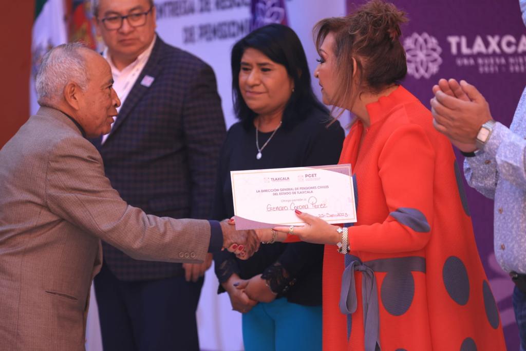 La gobernadora de Tlaxcala, Lorena Cuéllar Cisneros entregó este lunes recursos a 41 personas que se encontraban en lista de espera del resolutivo de su solicitud para jubilarse y pensionarse por vejez o viudez, las cuales se suman a las 116 que ya se habían cubierto en una primera etapa.