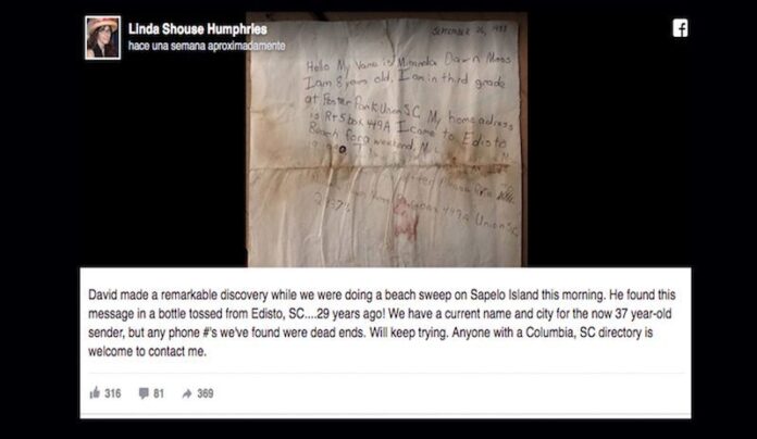 «David hizo un descubrimiento asombroso esta mañana mientras estábamos haciendo una limpieza de playa en la isla Sapelo», contó Linda en un ‘post’ en Facebook. «Encontró este mensaje en una botella arrojada desde Edisto, Carolina del Sur ¡hace 29 años! Tenemos el nombre y la ciudad actuales del remitente que ahora tiene 37 años, pero los números de teléfono que hemos encontrado fueron un punto muerto. Seguiremos intentándolo».