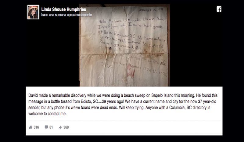 «¡Lo más increíble acaba de suceder!», escribió ella en la red social. «Recibí un mensaje en Facebook. Linda Humphries encontró el mensaje en una botella que yo había arrojado al océano. «¡Tenía 8 años! ¡Lo encontró en la isla Sapelo y me lo va a enviar! ¡Muy genial!»
