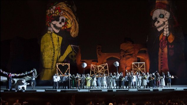En la versión de la “Carmen” de Valentina Carrasco hay un muro como el que busca construir Trump y esculturas de los héroes patrios de Estados Unidos, junto a sombreros charros, rebozos, muchas calaveras, la Catrina y su catrín, la Santa Muerte (ya sin rayos ni flores al pie), y claro, la tragedia universal del amor entre seres marginados.