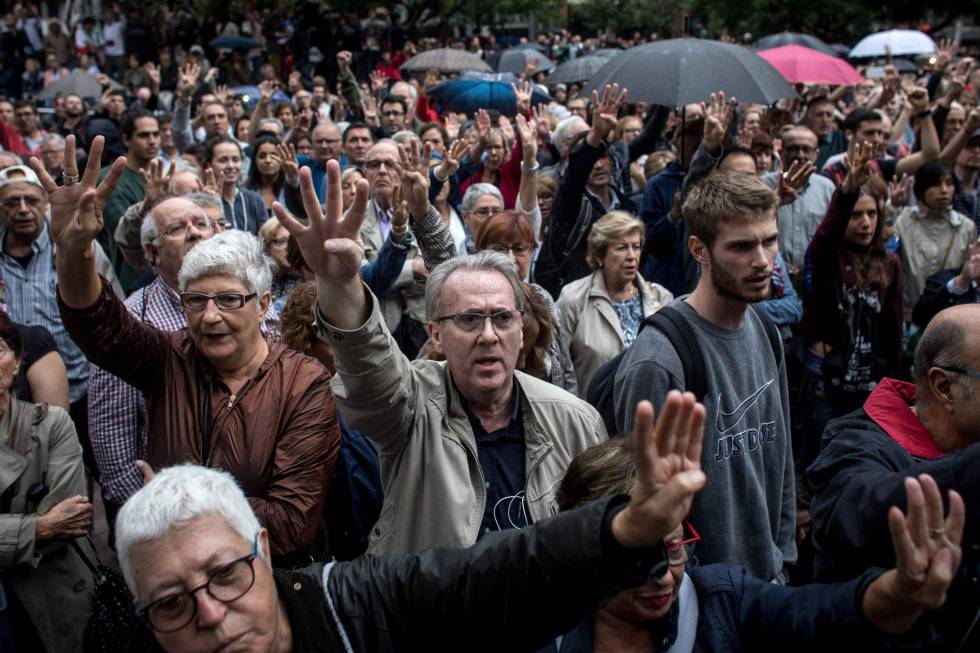 Cabe destacar la escasa popularidad de la bandera oficial si nos atenemos a las expresiones de la calle, las redes y las secciones de comentarios de la prensa. Tal vez los opositores al secesionismo catalán consideraron innecesario expresar públicamente su punto de vista (la inacción suele interpretarse como validación de la autoridad). En la Cibeles de Madrid y otros sitios, grupos muy reducidos de opositores ondearon la bandera española, y ayer mismo, el españolista ABC reportó que apenas “centenares de personas” se juntaron en la Plaza Mayor para repudiar “la declaración unilateral de independencia de Cataluña”, gritaron vivas a la Guardia Civil y parafrasearon una consigan izquierdista: “España unida jamás será vencida”.