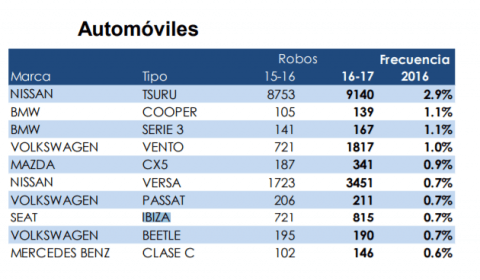 Le siguen las marcas Nissan, con el Tsuru (2.9 por cada 100) y Versa (0.7%); BMW, con el Cooper y el Serie 3, con 1.1% cada uno; Mazda, con el CX5 (0.9%); Seat con el Ibiza (0.7%) y Mercedes Benz con el Clase C (0.6%).