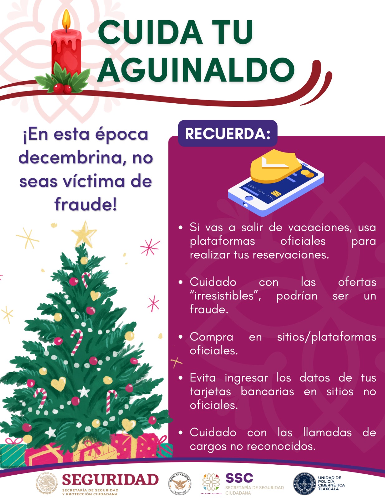 Finalmente, recomendó a la ciudadanía que si salen de vacaciones utilicen plataformas oficiales para realizar reservaciones; que tengan cuidado con ofertas “irresistibles” porque podría ser un fraude, además de solo comprar en sitios/plataformas oficiales; evitar ingresar datos de tarjetas bancarias en sitios no oficiales, y ser cuidadosos con llamadas de cargos no reconocidos.