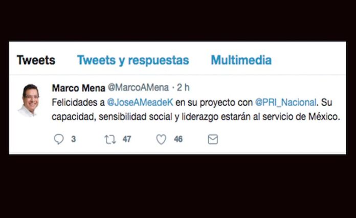 El primer priísta de Tlaxcala, Marco Mena, felicitó a través de sus redes sociales a José Antonio Meade, quien dejó la Secretaría de Hacienda y Crédito Público para realizar su registro como precandidato del PRI a la Presidencia de la República.