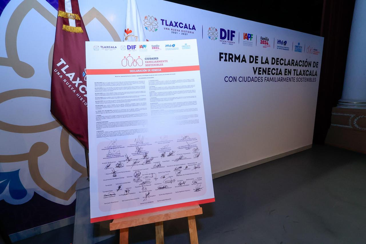 Con la finalidad de fomentar la inclusión de las familias en el desarrollo de comunidades y ciudades, situándolas en el centro de las políticas públicas, la gobernadora Lorena Cuéllar Cisneros firmó la Declaración de Venecia en Tlaxcala, entre la Organización de las Naciones Unidas (ONU), el Sistema Estatal para el Desarrollo Integral de la Familia (Sedif) y presidentes municipales electos.