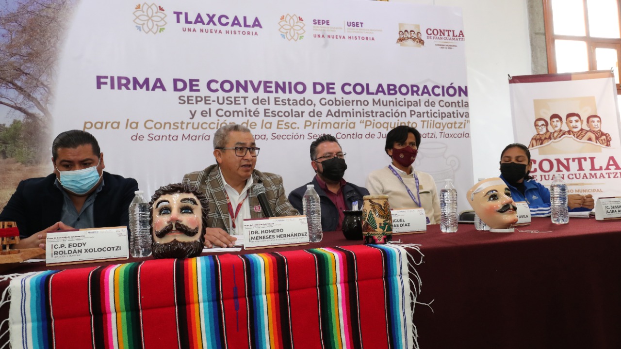 Autoridades de la Secretaría de Educación Pública del Estado (SEPE) y municipales de Contla, así como el Comité Escolar de Administración Participativa, llevaron a cabo la firma de convenio para la construcción de la escuela primaria “Pioquinto Tlilayatzi”, con una inversión en su primera etapa de 5.7 millones de pesos.