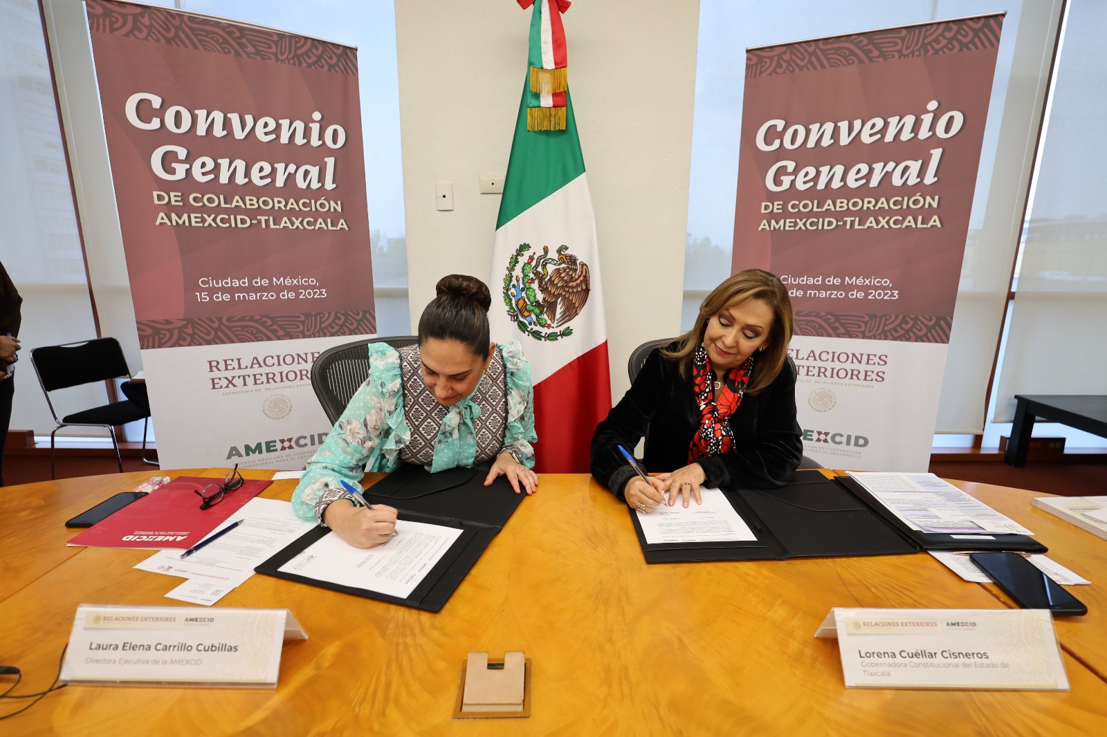 La gobernadora Lorena Cuéllar Cisneros y la directora ejecutiva de la Agencia Mexicana de Cooperación Internacional para el Desarrollo (Amexcid), Laura Elena Carrillo Cubillas, firmaron un Convenio General de Colaboración que permitirá promover mecanismos y acciones conjuntas en diversos rubros en beneficio de la población tlaxcalteca.