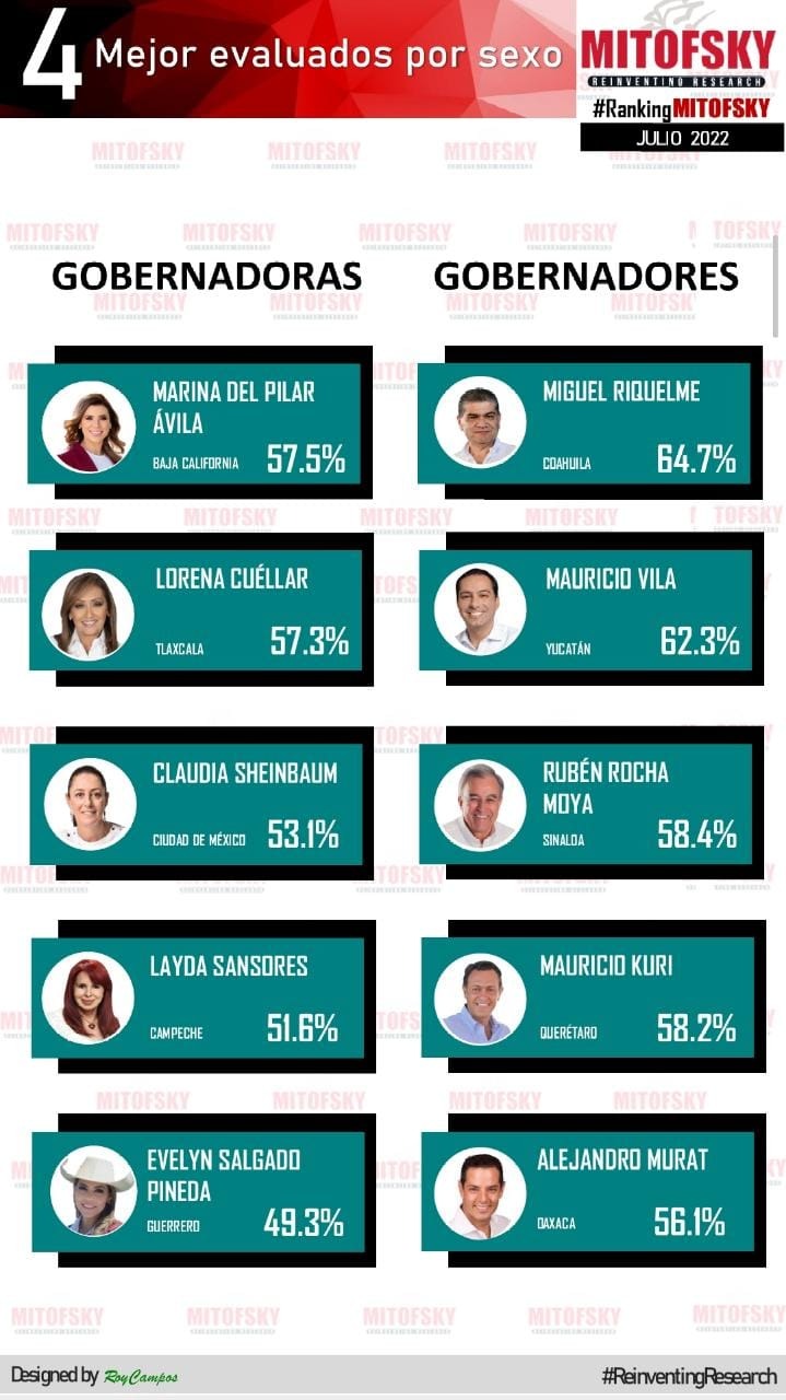 En el ranking de las cuatro gobernadoras y gobernadores mejor evaluados por sexo, la mandataria tlaxcalteca se encuentra en la segunda posición con el 57.3 por ciento, apenas un lugar menor que su homóloga de Baja California, Marina del Pilar Ávila con 57.5 por ciento y por arriba de la jefa de Gobierno de la Ciudad de México, Claudia Sheinbaum que registra el 53.1 de aprobación, así como de las gobernadoras de Campeche, Layda Sansores con 51.6 por ciento y Evelyn Salgado de Guerrero con 49.3 por ciento.