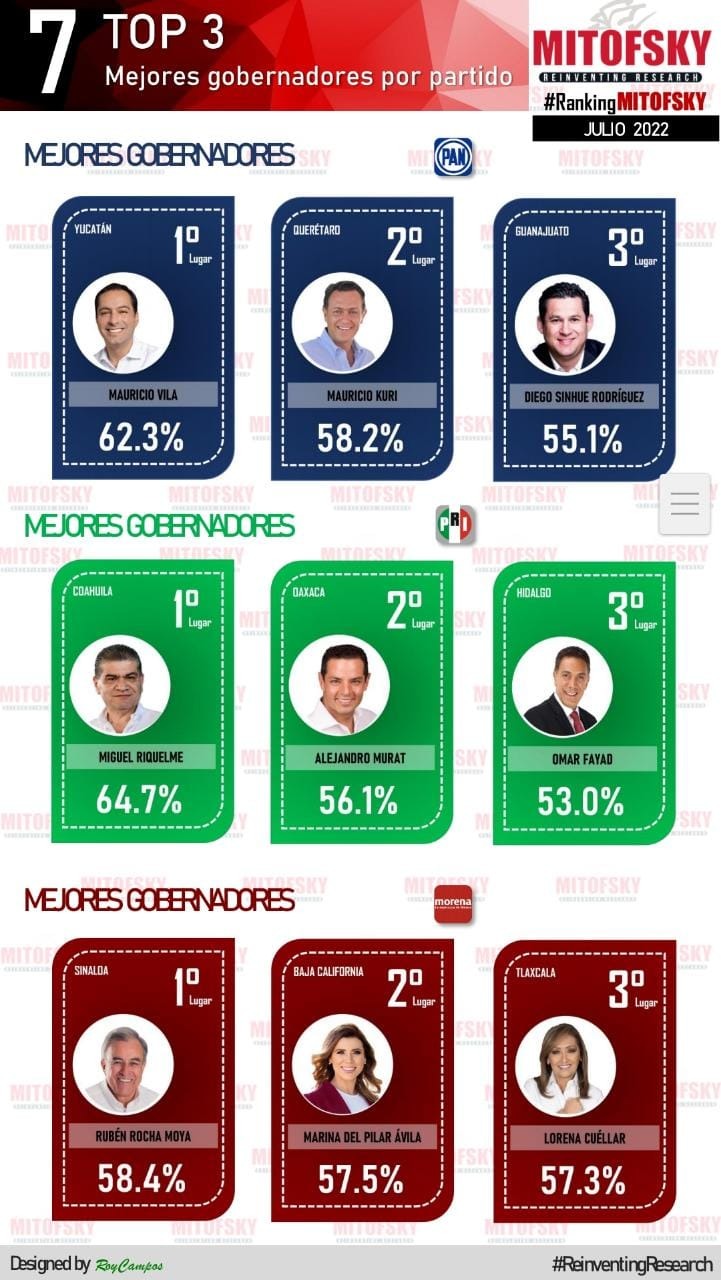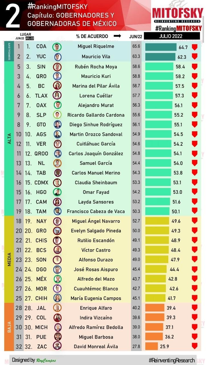 Por tercer mes consecutivo la mandataria estatal se mantiene en el sexto lugar en el rango de los 32 gobernadores y gobernadoras mejor evaluados, por arriba de los gobernadores de Oaxaca, Alejandro Murad; de San Luis Potosí, Ricardo Gallardo; de Guanajuato, Diego Sinhue Rodríguez y de Aguascalientes, Martin Orozco Sandoval, quienes ocupan el séptimo, octavo, noveno y décimo lugar, respectivamente.