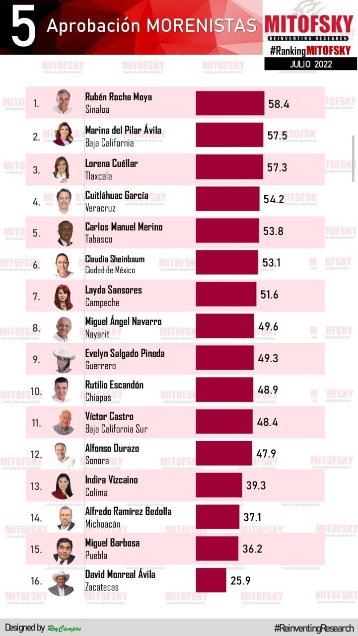 Respecto a la aprobación de mandatarios morenistas, ocupa el tercer lugar, por arriba de los gobernadores de Veracruz, Cuitláhuac García y de Tabasco, Carlos Manuel Merino.