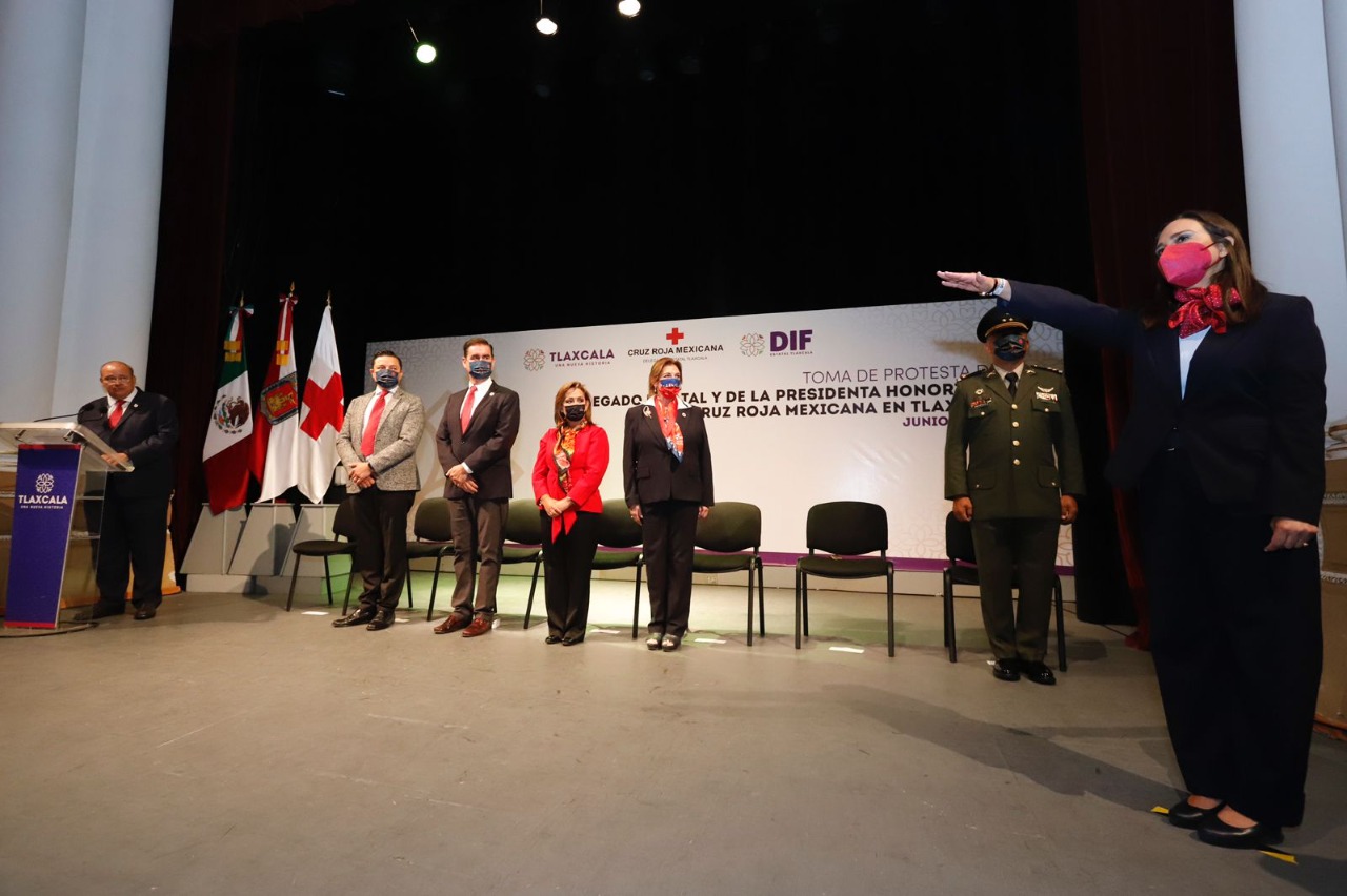 La gobernadora Lorena Cuéllar Cisneros y el presidente nacional de Cruz Roja Mexicana, Fernando Suinaga Cárdenas, tomaron protesta al delegado estatal y a la presidenta honorífica de la Cruz Roja en Tlaxcala, Miguel García Méndez Salazar y Mariana Espinosa de los Monteros Cuéllar, respectivamente, a quienes les desearon éxito en esta labor social que desempeñarán en beneficio de la población.