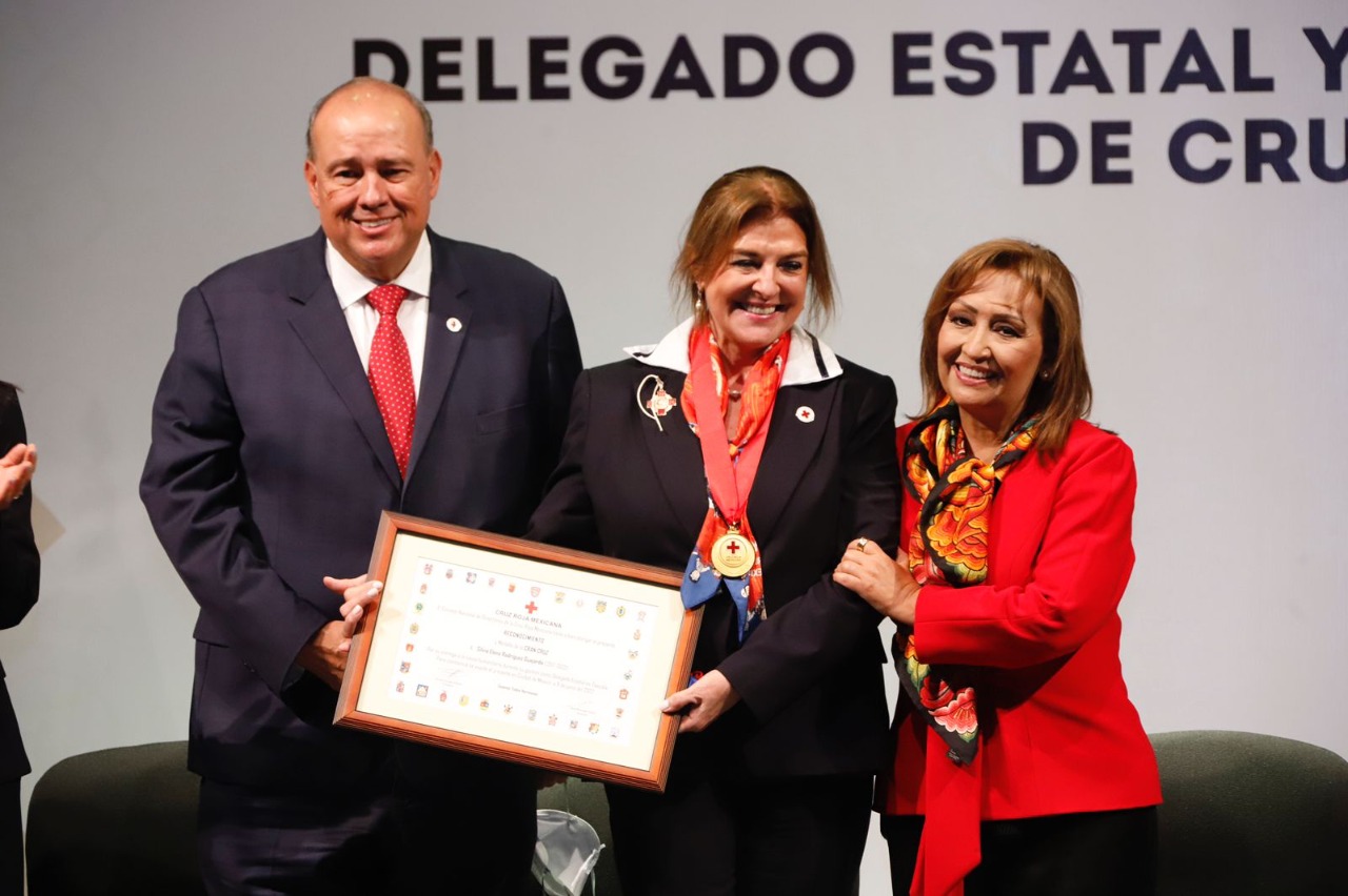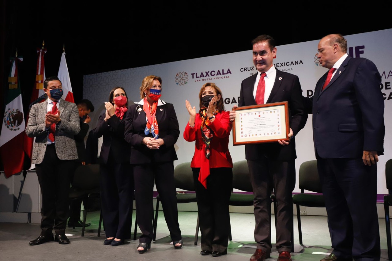 En el Teatro Xicohténcatl, la mandataria estatal felicitó a Silvia Elena Rodríguez de Espino por su gran desempeño durante los cinco años que estuvo al frente de la delegación Cruz Roja y reconoció la loable labor de esta institución al servicio de la ciudadanía durante 112 años, “siempre están presentes para prestar auxilio o socorro a quien lo necesita, es mucho lo que debemos de reconocerles”.