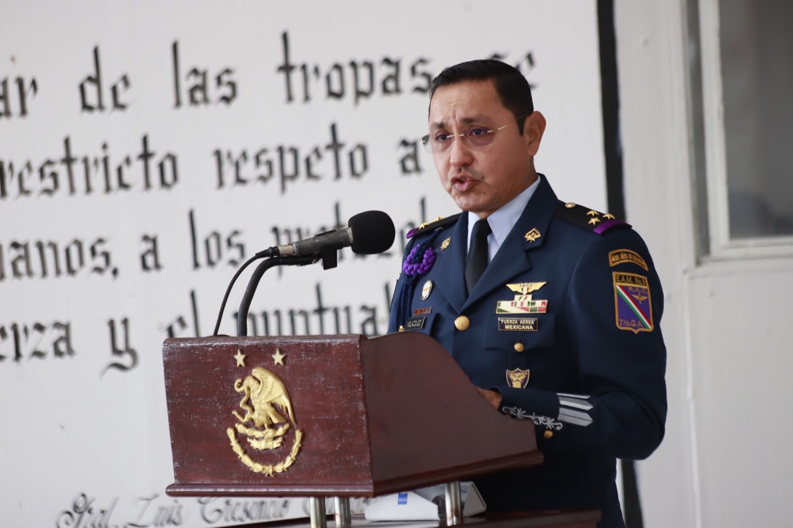 En su intervención, el comandante del Séptimo Grupo Aéreo, José Gilberto Velázquez Murillo, realizó una breve reseña de la creación de la FAM como institución, “cuyo origen es el arma de la aviación militar, instaurada el 5 de febrero de 1915 por don Venustiano Carranza, primer jefe del Ejército Constitucionalista. Cabe resaltar que previamente en 1912, el presidente Francisco I. Madero comprendió la importancia que representaba el empleo de aeronaves”.