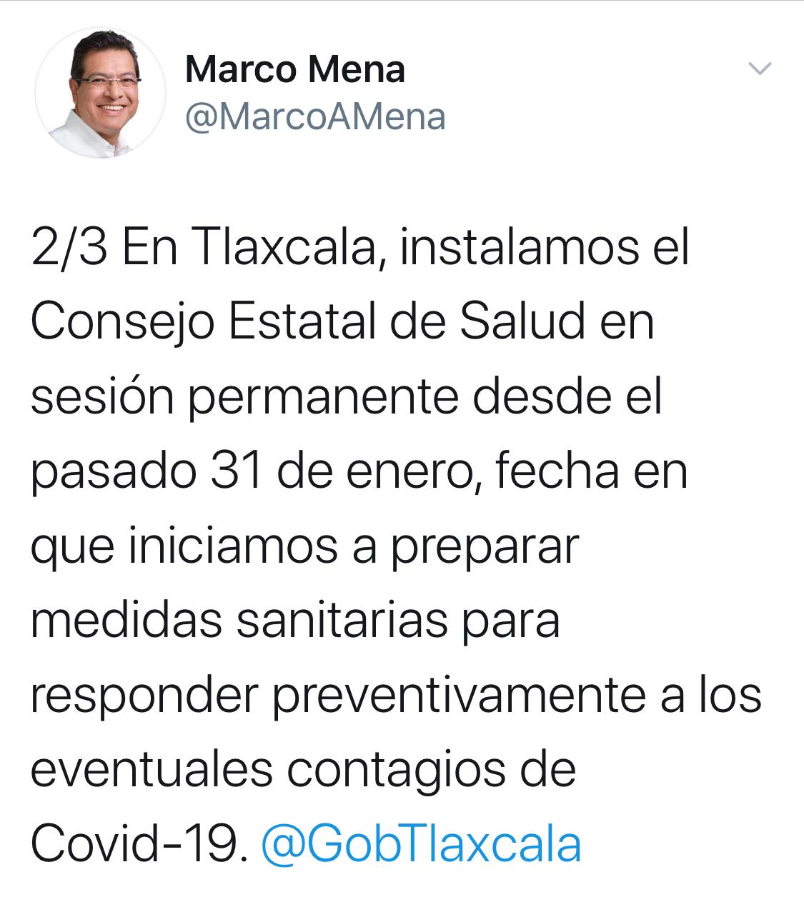 En un segundo mensaje publicó: «En Tlaxcala, instalamos el Consejo Estatal de Salud en sesión permanente desde el pasado 31 de enero, fecha en que iniciamos a preparar medidas sanitarias para responder preventivamente a los eventuales contagios de Covid-19. @GobTlaxcala».