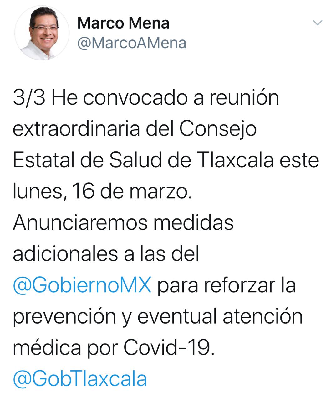 Finalmente, en un tercer mensaje escribió: «He convocado a reunión extraordinaria del Consejo Estatal de Salud de Tlaxcala este lunes, 16 de marzo. Anunciaremos medidas adicionales a las del @GobiernoMX para reforzar la prevención y eventual atención médica por Covid-19. @GobTlaxcala».