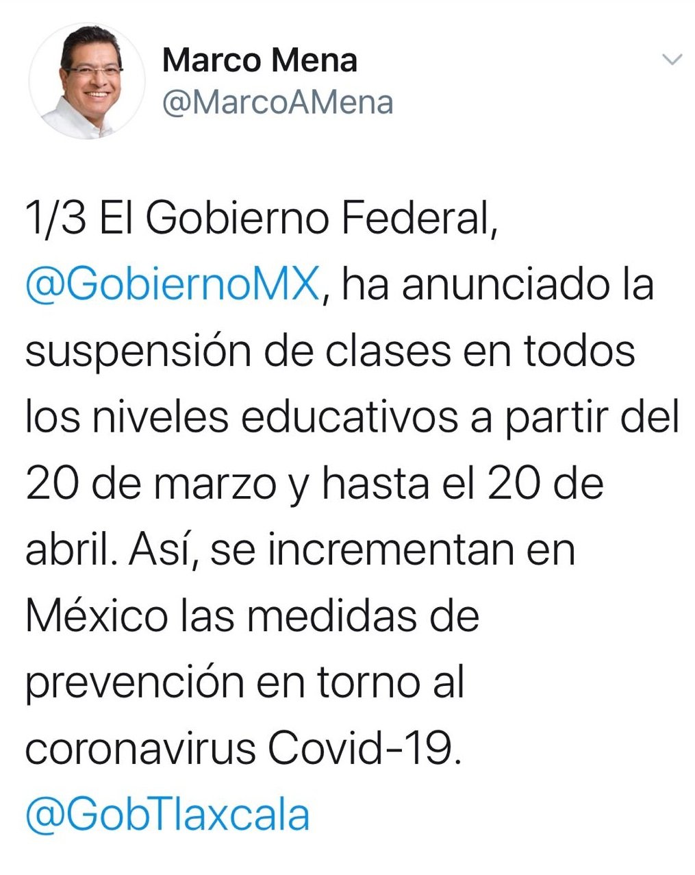 En su cuenta de Twitter el Gobernador Marco Mena escribió: «El Gobierno Federal, @GobiernoMX, ha anunciado la suspensión de clases en todos los niveles educativos a partir del 20 de marzo y hasta el 20 de abril. Así, se incrementan en México las medidas de prevención en torno al coronavirus Covid-19. @GobTlaxcala».