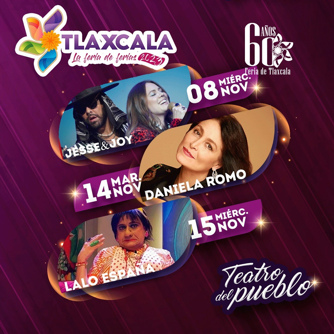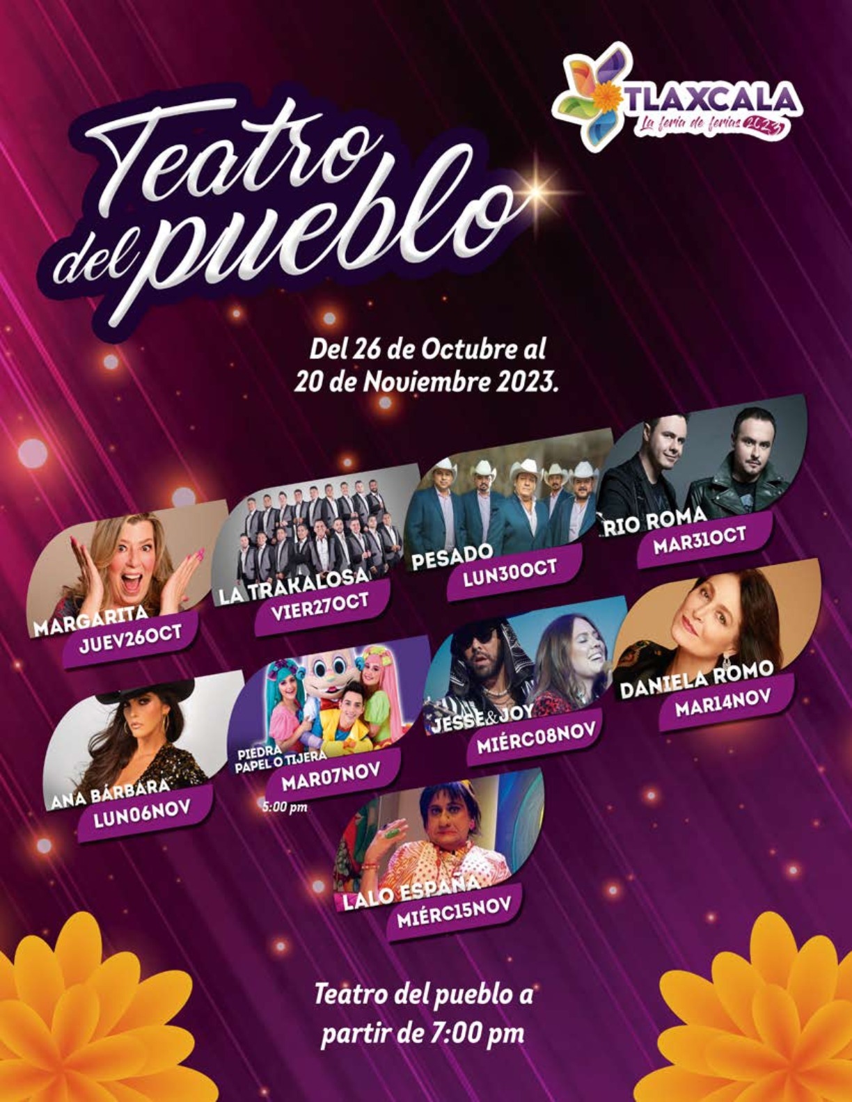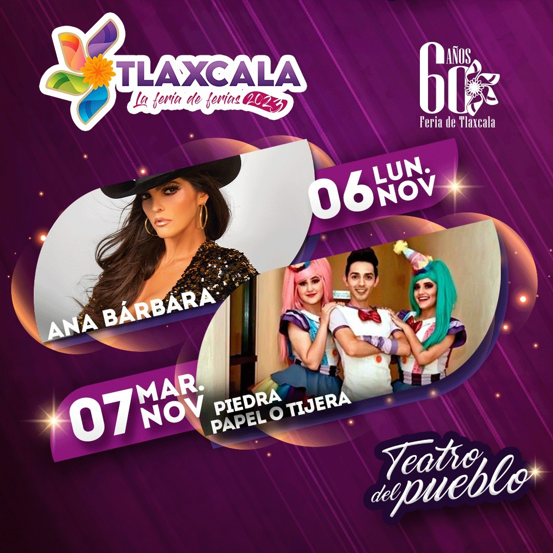 Posteriormente, el lunes 06 de noviembre el Teatro del Pueblo se engalanará con la belleza grupera de Ana Bárbara; el martes 07 a las 17:00 horas, chicos y grandes vivirán emocionantes aventuras con los hermanos Mindy, Miko y Moly, integrantes del grupo Piedra, Papel o Tijera; el miércoles 08, los fanáticos de Jesse y Joy vivirán una experiencia extraordinaria al tener en tierras tlaxcaltecas a sus músicos preferidos.