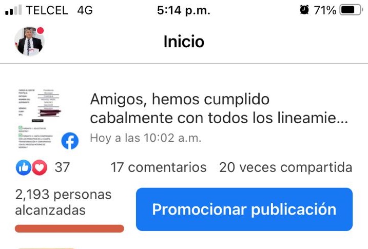 Por último, MASS se congratuló de que en apenas unas horas de este viernes, la publicación en Facebook de su registro por MORENA alcanzó a unas 2,500 usuarios, muchos de los cuales compartieron el post e hicieron comentarios elogiosos.