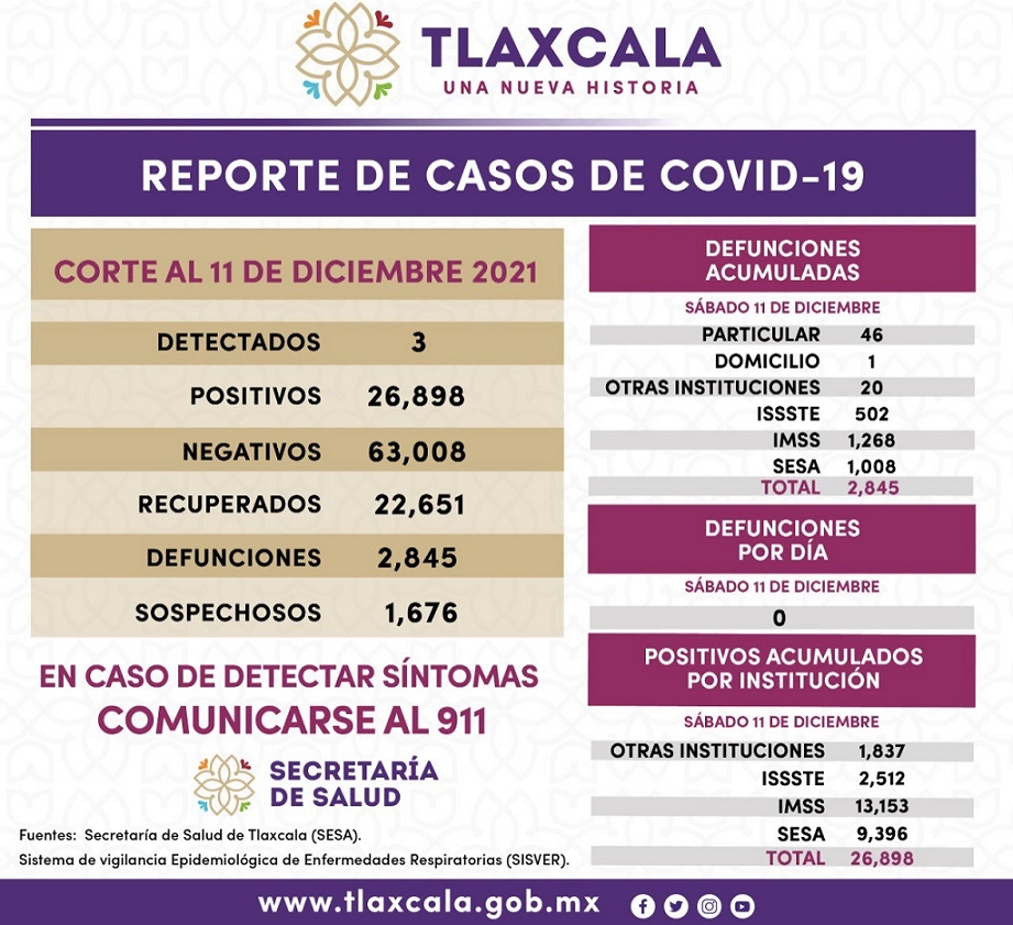 Tlaxcala registra a la fecha un saldo histórico de 26 mil 898 personas contagiadas de covid, de las cuales han fallecido 2,845. Ello arroja una tasa estatal de letalidad de 10.6% (esto es, muere uno de cada 9.4 contagiados).
