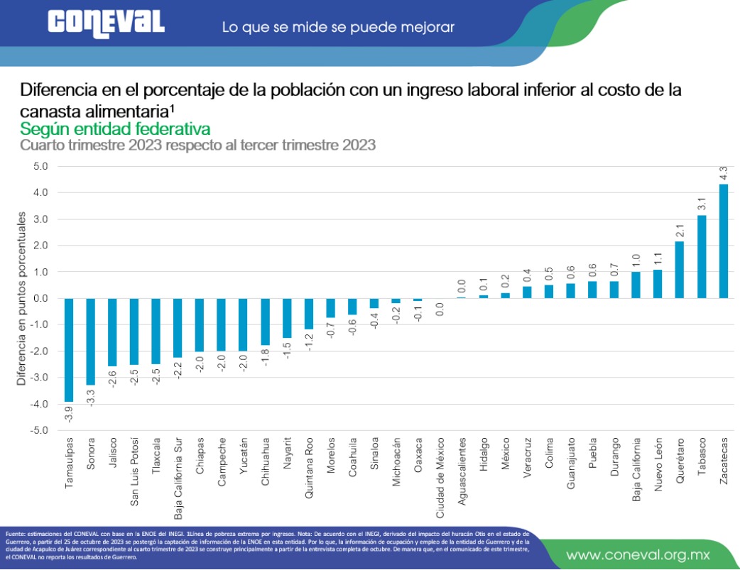 Además, el porcentaje de la población con ingreso laboral inferior al costo de la canasta alimentaria, al cierre del cuarto trimestre de 2023, fue el segundo valor más bajo desde el registro de la medición en 2010.