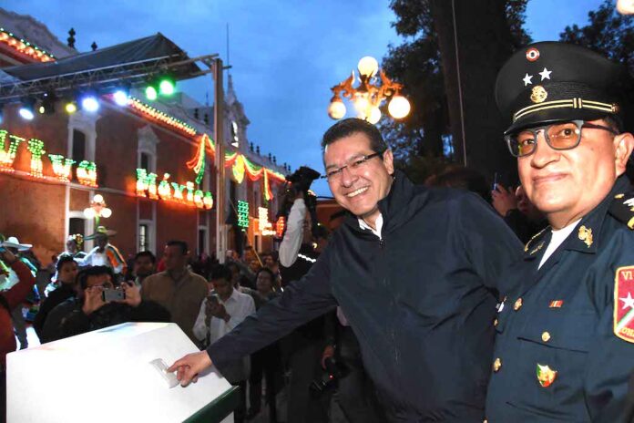 El gobernador Marco Mena encabezó el encendido de la iluminación de la fachada del Palacio de Gobierno alusiva a las fiestas patrias, acompañado por su esposa, Sandra Chávez Ruelas y titulares de los tres poderes en el Estado.
