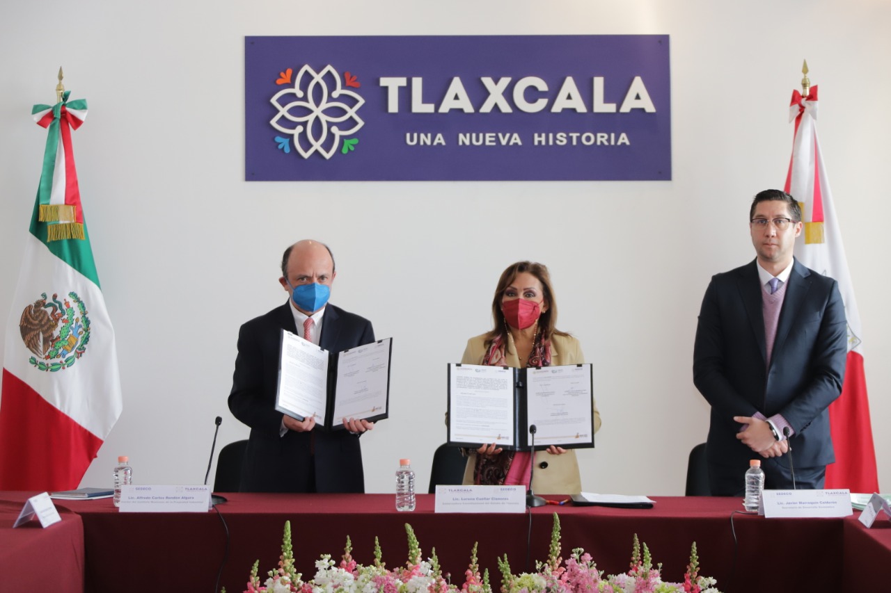 La gobernadora Lorena Cuéllar Cisneros atestiguó la firma del convenio de colaboración entre la Secretaría de Desarrollo Económico (Sedeco) y el Instituto Mexicano de la Propiedad Industrial (IMPI) para que Tlaxcala amplíe el uso de la protección a la propiedad intelectual y a la innovación, además de extender entre la población el conocimiento y la cultura sobre las ventajas de resguardar la propiedad de las creaciones, invenciones, obras, símbolos y marcas usadas en el comercio.